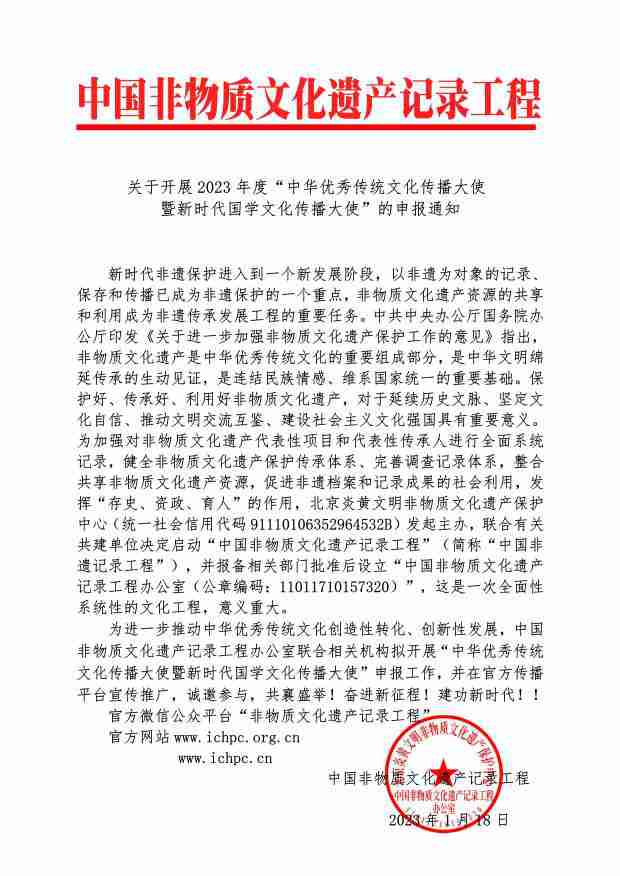为进一步推动中华优秀传统文化创造性转化、创新性发展,中国非物质文化遗产记录工程办公室联合相关机构拟开展“中华优秀传统文化传播大使暨新时代国学文化传播大使”申报工作,并在官方传播平台宣传推广,诚邀参与,共襄盛举!奋进新征程!建功新时代!!