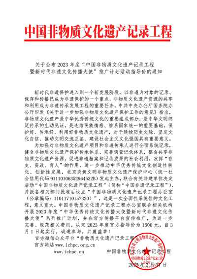 为加强对非物质文化遗产项目和非遗传承人进行全面系统记录,健全非物质文化遗产保护传承体系、完善调查记录体系,整合共享非物质文化遗产资源,促进非遗档案和记录成果的社会利用,发挥“存史、资政、育人”的作用,进一步推动中华优秀传统文化创造性转化、创新性发展,北京炎黄文明非物质文化遗产保护中心(统一社会信用代码91110106352964532B)发起主办,联合有关共建单位决定启动“中国非物质文化遗产记录工程”(简称“中国非遗记录工程”),并报备相关部门批准后设立“中国非物质文化遗产记录工程办公室(公章编码:11011710157320)”,这是一次全面性系统性的文化工程,意义重大。中国非物质文化遗产记录工程办公室联合相关机构开展2023年度“中华优秀传统文化传播大使暨新时代非遗文化传播大使”系列推广计划,并在官方传播平台宣传推广,诚邀参与,共襄盛举!